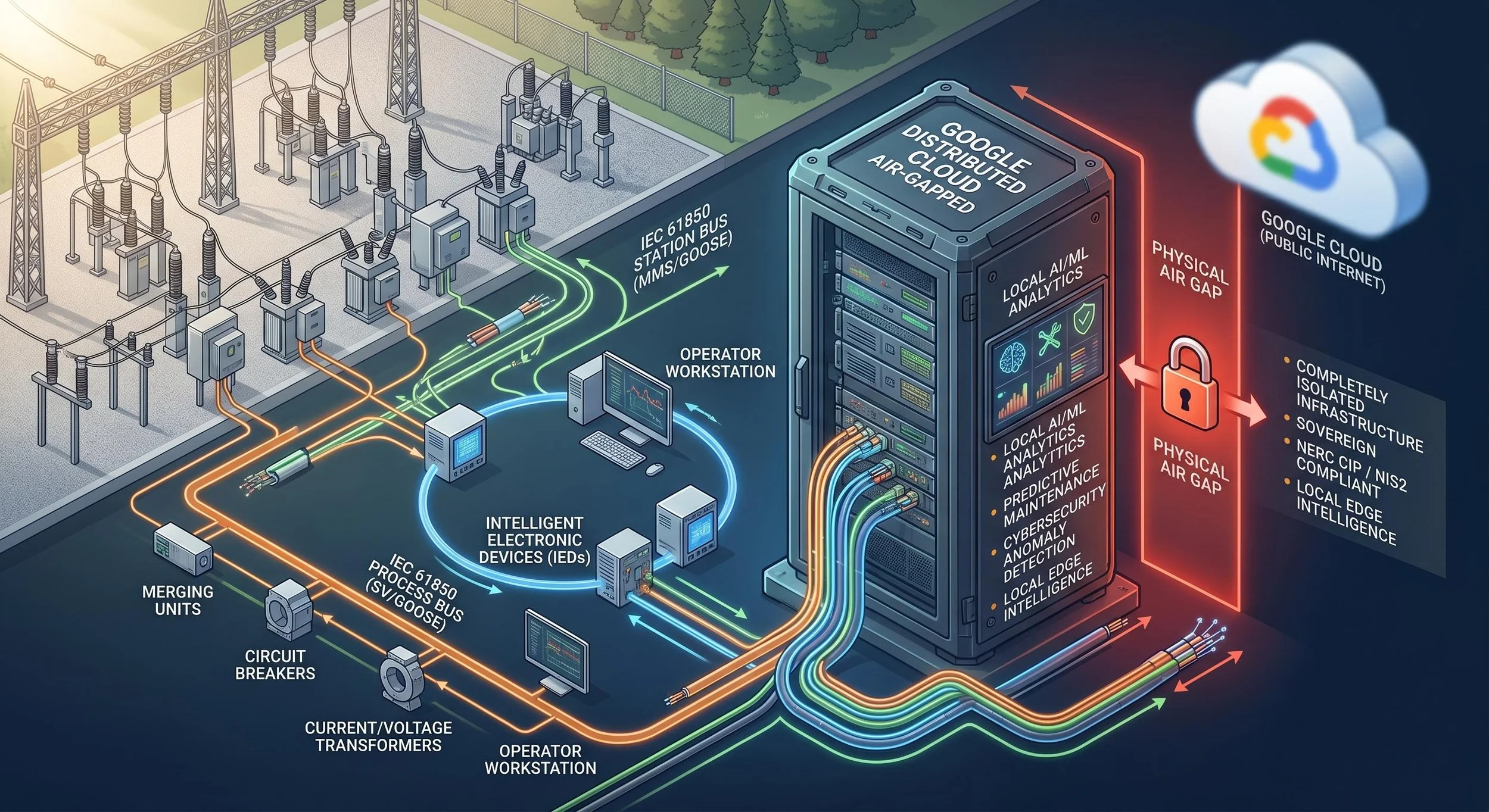 Our specialized service offering leverages Google Distributed Cloud (GDC) Air-Gapped to bring the power of AI, modern containerization, and planet-scale security to the substation fence line. We bridge the gap between legacy OT (Operational Technology) and future-ready IT, ensuring your IEC 61850 environment remains isolated, resilient, and intelligent.